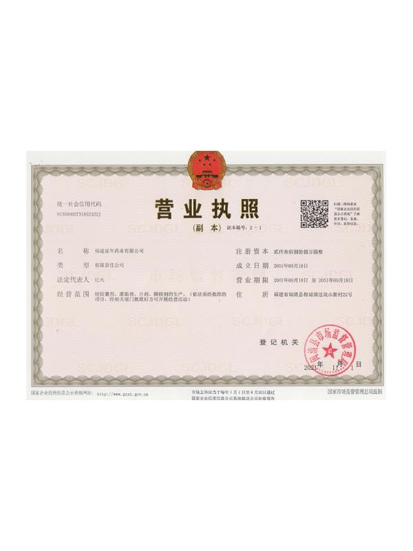 福建延年藥業(yè)有限公司位于福州市閩清縣城關(guān),工廠坐落在風(fēng)景秀美的梅城森林公園山腳下,公司前身是中國人民解放軍第9747工廠,創(chuàng)辦于1970年9月,隸屬南京軍區(qū)總后勤部,企業(yè)的地方名稱為福建閩清制藥廠。1998年6月為貫徹中央關(guān)于軍隊(duì)不再從事經(jīng)商活動(dòng)的決議,企業(yè)軍轉(zhuǎn)地改制移交地方,2001年9月企業(yè)改制,更名為福建延年藥業(yè)有限公司。
